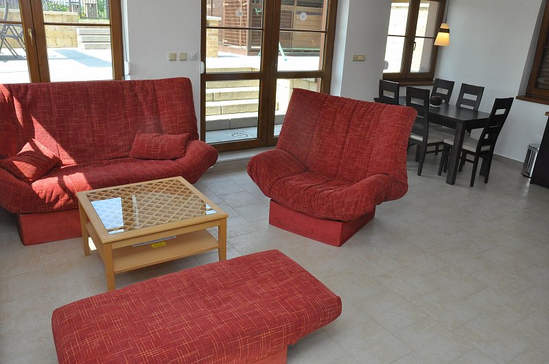 Ve spodním patře se nachází ve společné místnosti prostorný obývací pokoj s moderně zařízenou kuchyní a jídelnou (jako přistýlky /dvě dvoulůžkové postele/ lze využít rozkládací sedací soupravy).